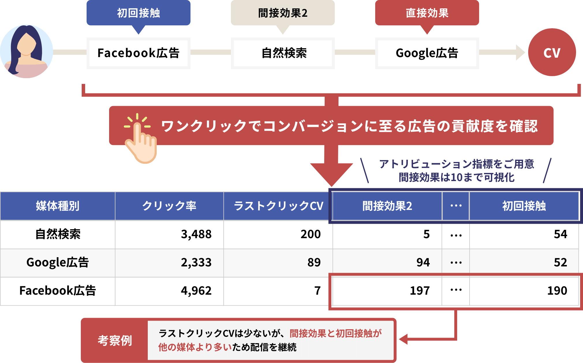 最後にクリックされたチャネル(ラストクリック)だけでなく、その前の接点も含めて効果を把握できます。